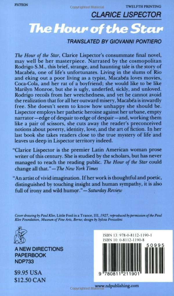 Narrated by the cosmopolitan Rodrigo S.M., this brief, strange, and haunting tale is the story of Macabéa, one of life’s unfortunates. Living in the slums of Rio and eking out a poor living as a typist, Macabéa loves movies, Coca-Colas, and her rat of a boyfriend; she would like to be like Marilyn Monroe, but she is ugly, underfed, sickly and unloved. Rodrigo recoils from her wretchedness, and yet he cannot avoid the realization that for all her outward misery, Macabéa is inwardly free/She doesn’t seem to know how unhappy she should be. Lispector employs her pathetic heroine against her urbane, empty narrator―edge of despair to edge of despair―and, working them like a pair of scissors, she cuts away the reader’s preconceived notions about poverty, identity, love and the art of fiction. In her last book she takes readers close to the true mystery of life and leave us deep in Lispector territory indeed.