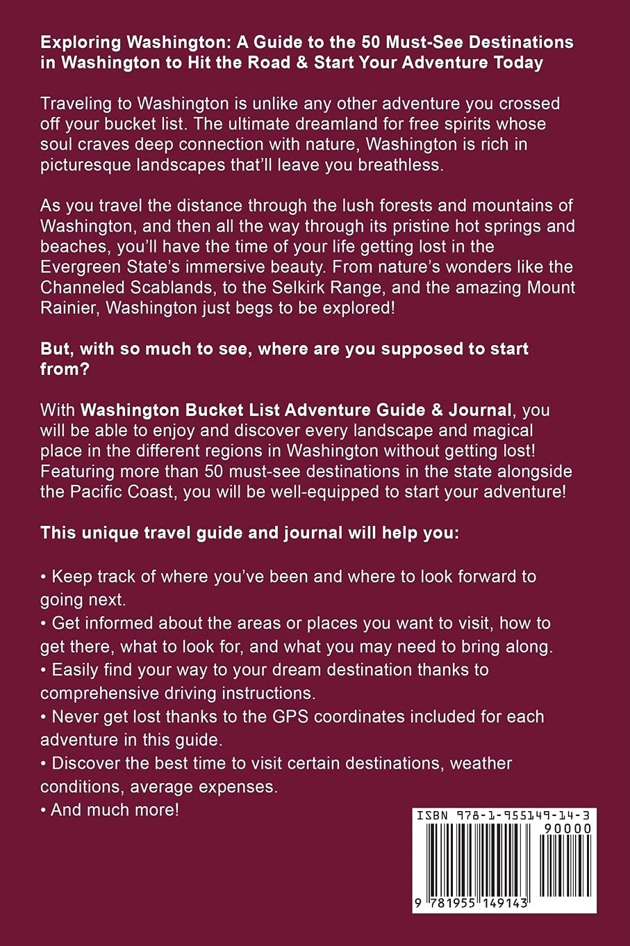 With Washington Bucket List Adventure Guide & Journal, you will be able to enjoy and discover every landscape and magical place in the different regions in Washington without getting lost! Featuring more than 50 must-see destinations in the state alongside the Pacific Coast, you will be well-equipped to start your adventure!